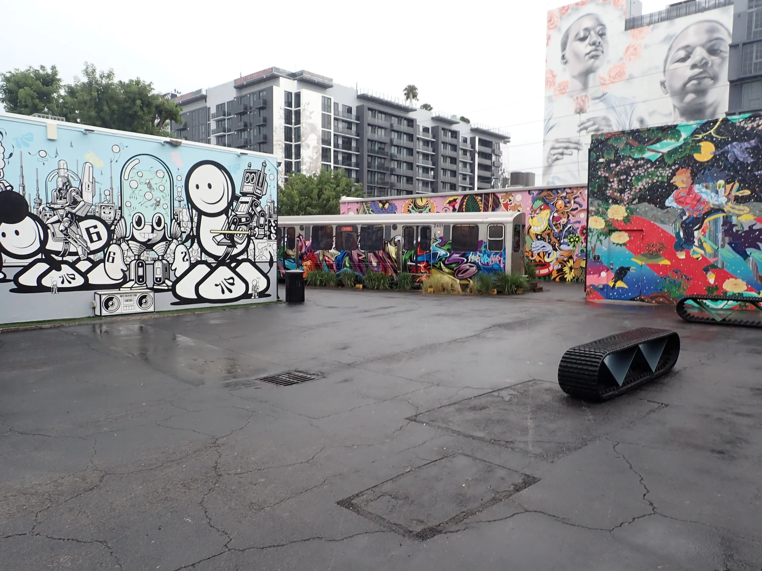 open-air art complex of Wynwood Art District, surrounded by bold graffiti murals, concrete pathways, and a vibrant urban setting.